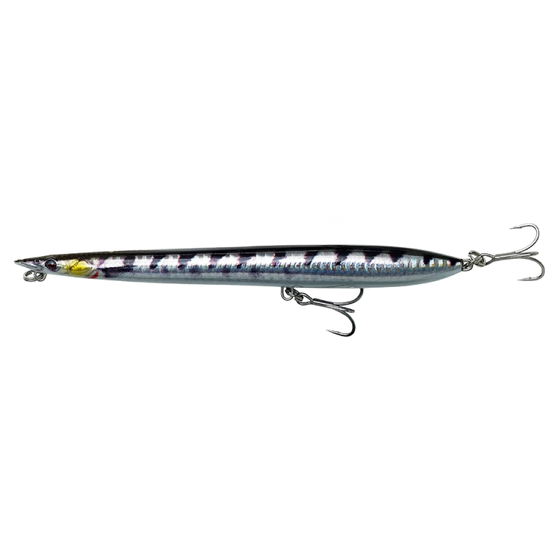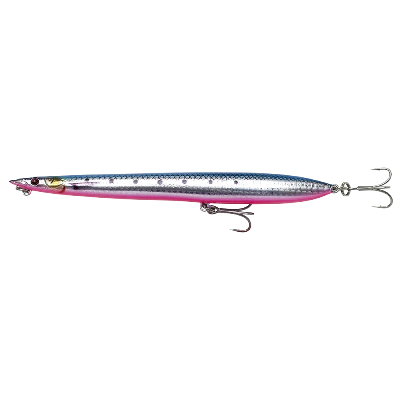 Based on the perfect 3D Scan of a real Sandeel. The long slender Strong Hard ABS body has the most incredible side-to-side action on the twitch and a slim S-curve action on a straight retrieve. The Floating version has a horizontal balance. slightly keeping the head upon the spin stop – creating the perfect wounded baitfish profile. The long cast design is silent – the perfect topwater lure for more wary predator fish. Fishing Method: Slow twitching while retrieving and the lure will perform wide slow side to side action, and with fast-twitch will perform fast and sharp side to side action. With the rod tip high and fast retrieve, the lure will perform skipping action imitating a feeling Prey fish.