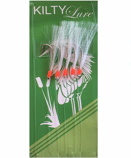 Kilty Mackerel P/N White Flasher. A white fibre mackerel paternoster with additional flashabou tied on 5 No. 1/0 hooks.